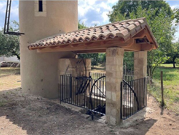 Les travaux ont consisté en la rénovation de la citerne et du fût en pierre ainsi qu’en la construction d’un abri neuf remplaçant le vieux cabanon en bois pour protéger le mécanisme tout en le rendant visible au public.