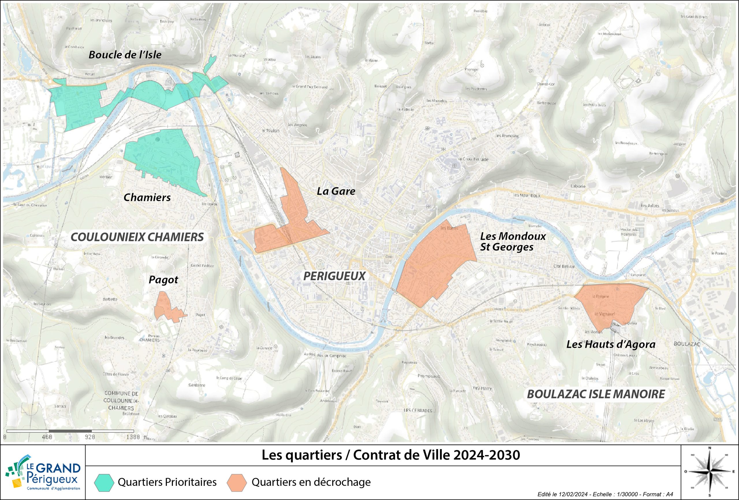 carte du grand Périgueux montrant les deux quartiers prioritaires de l'agglomération. Celui de la boucle de l'Isle à Périgueux et celui de Chamiers. Ainsi que les quatre quartiers en décrochage. Celui de Pagot à Coulounieix, ceux des Mondoux et de la gare à Périgueux et celui des Hauts d'Agora à Boulazac-Isle-Manoire